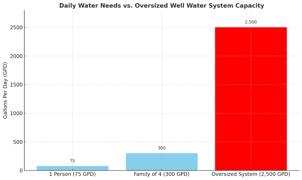 Imagine a salesman tells you that your well water is unsafe and pitches a state-of-the-art treatment system capable of filtering 2,500 gallons per day, roughly a $20,000 setup. It sounds impressive, but here’s the catch: your household might only use around 75 gallons of water per day on average. Most of that expensive system’s capacity would sit idle. Unfortunately, this scenario isn’t just a hypothetical; many big-brand water companies market one-size-fits-all systems that are wildly oversized for a normal home’s needs. The result? Homeowners end up paying exorbitant prices for capacity they’ll never use.